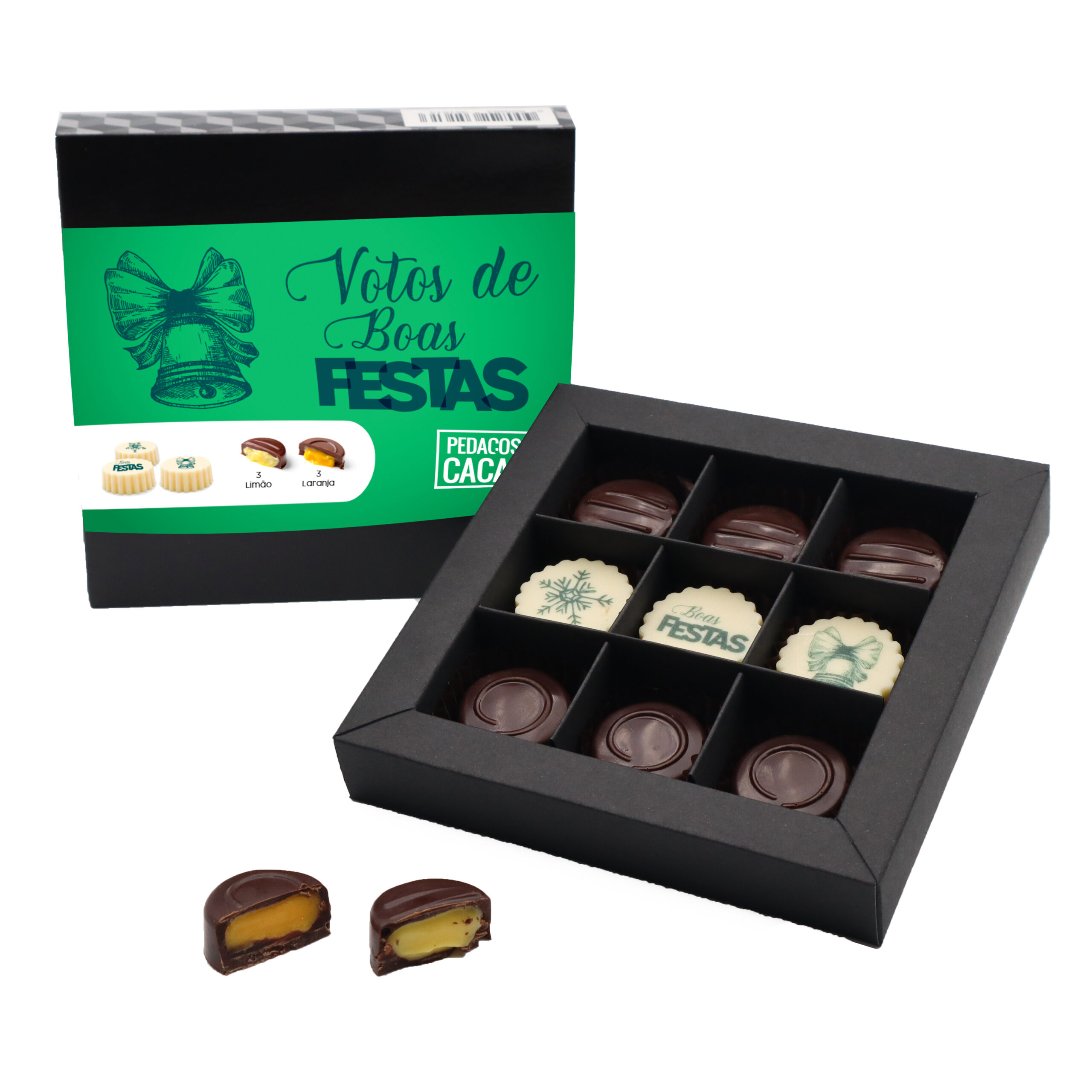 A nossa Caixa de 9 Chocolates – Boas Festas é o presente perfeito para surpreender familiares, amigos ou colegas com chocolate artesanal de excelência.